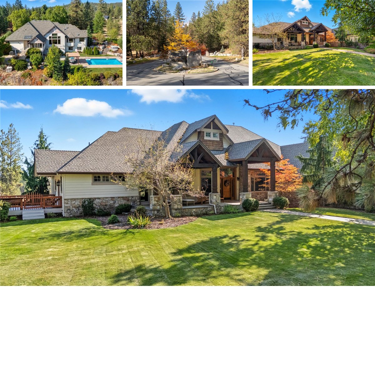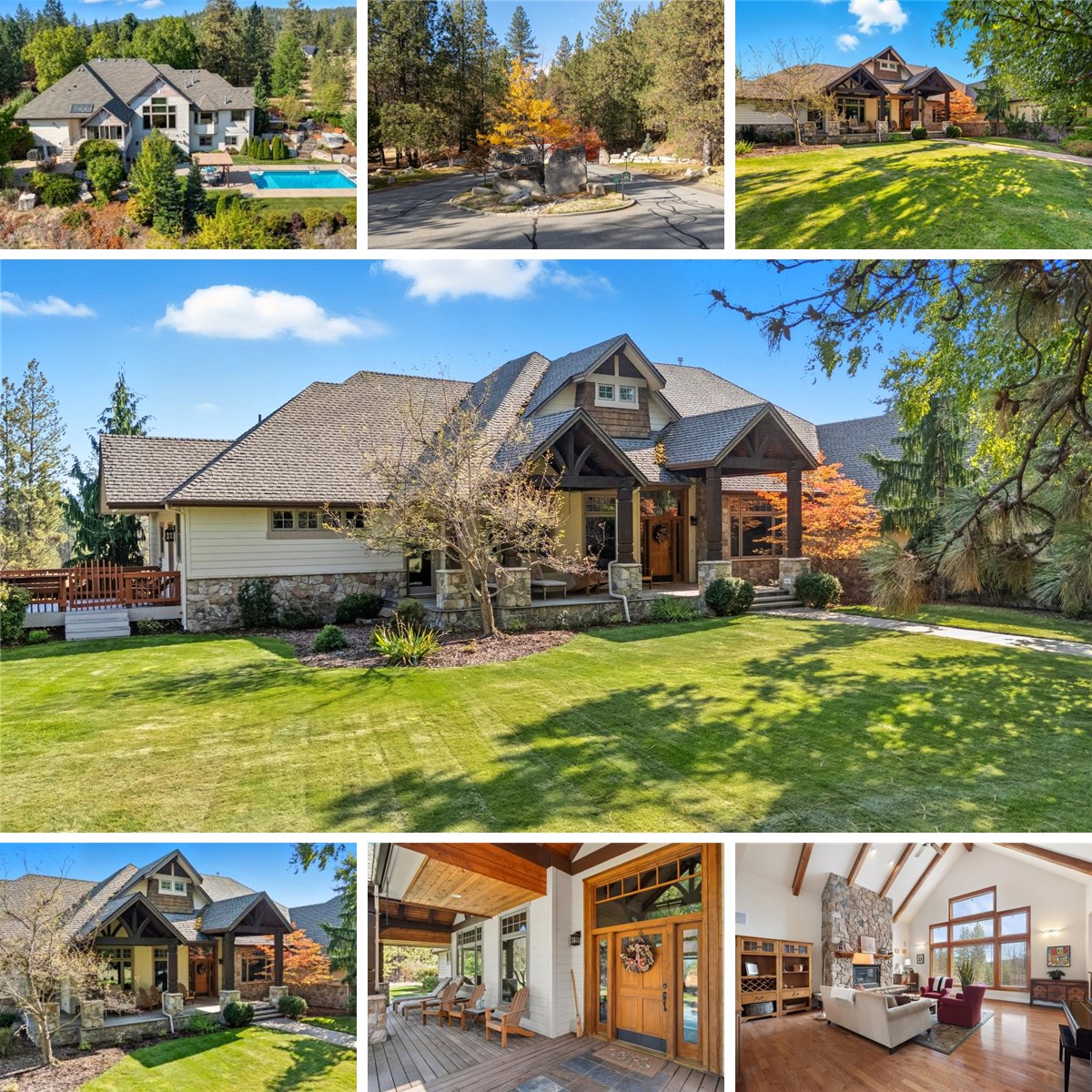Located on over 10 spectacular acres behind the gates in exclusive Riverbluff Estates, the location + setting of this exquisite custom Craftsman is private + serene, yet shopping, restaurants, St. George's School, the Little Spokane River Natural Area + Kalispel Golf + Country Club are only minutes away. Amenities include a beautiful open floor plan, generously appointed rooms, vaulted ceilings w/exposed beams, natural stone fireplaces + accents, spacious island kitchen, luxurious primary suite, sun room, fully finished lower level, private backyard space with patio, in-ground pool + hot tub, and room for a shop. Home comes equipped with all of the expected features of a home in this class, and the lower level could function easily for multi-generational living. This is a truly spectacular property!